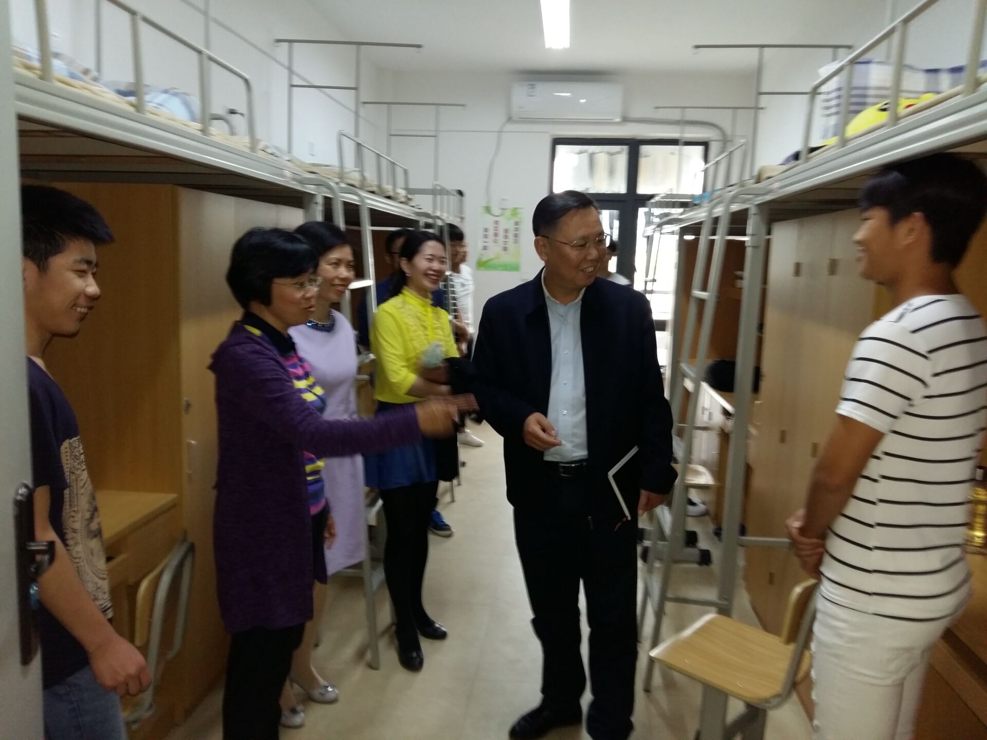随后,曾武祈书记来到D栋宿舍,与对接联系的203号宿舍学生亲切交流。首先,曾书记对该宿舍六位学生逐一认识;其次,曾书记从宿舍生活、业余文化生活以及人际交往等方面进行深入、细致沟通,进一步了解他们的学习生活情况;最后,曾书记希望同学们在学习上拼搏争优的同时丰富课余文化生活,充实过好每一天。