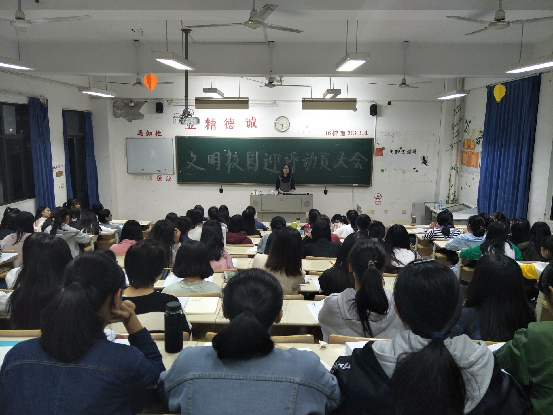 2017年11月6日晚上7:00,护理系召开迎接省级文明校园检查学生工作动员大会。大会首先由谢涛书记、林桂松副书记向全体辅导员传达学院迎评精神和学生管理工作布置要求。接下来,由辅导员组织各班级召开专题班会,将学院工作精神传达到每一位学生,并对每名学生的精神面貌、行为规范、环境美化都提出了具体的要求,鼓励学生以积极的心态投入迎评工作,也当作一次精神的洗礼。