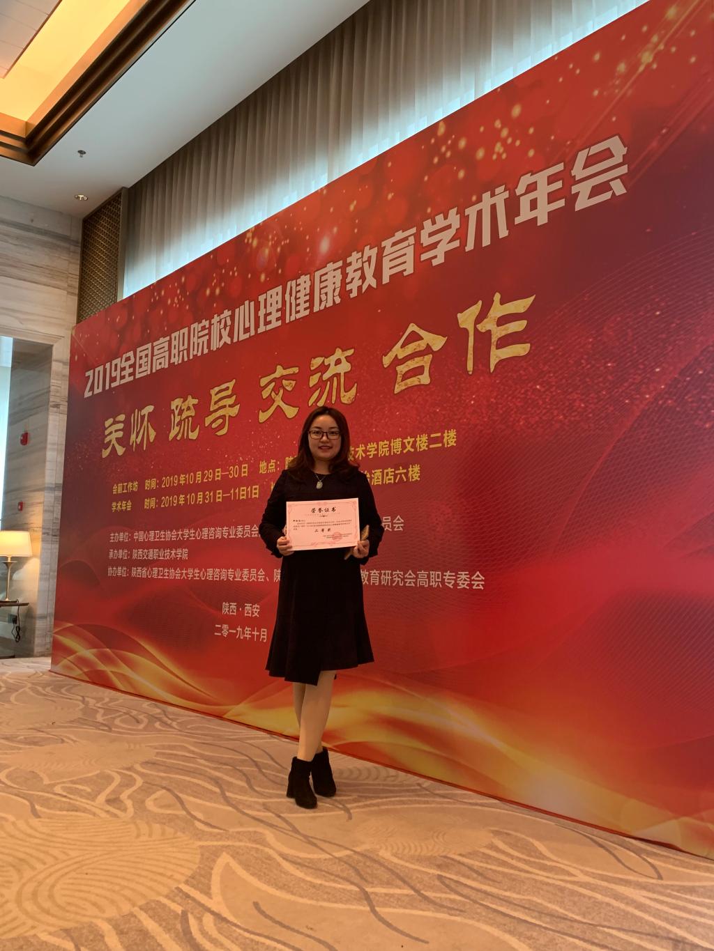 2019年10月31日—11月1日,护理系选派心理辅导站郑梅钦老师参加了于陕西西安举行的“2019年全国高职院校心理健康教育学术年会暨表彰大会”。本次大会以“关怀 疏导 交流 合作”为主题,围绕高职院校育心与育德工作相结合的模式、心理育人五位一体工作新格局建设研究、精神卫生法框架下的高职院校心理育人的创新性探索、大数据技术合作与高职院校心理育人的信息化管理研究、心理育人工作与学生管理工作联动机制实践研究、高职院校学生心理咨询与心理危机预防干预案例研究、高职院校学生心理育人工作体制机制和队伍建设研究等七个议题,开展深入的交流和研讨。