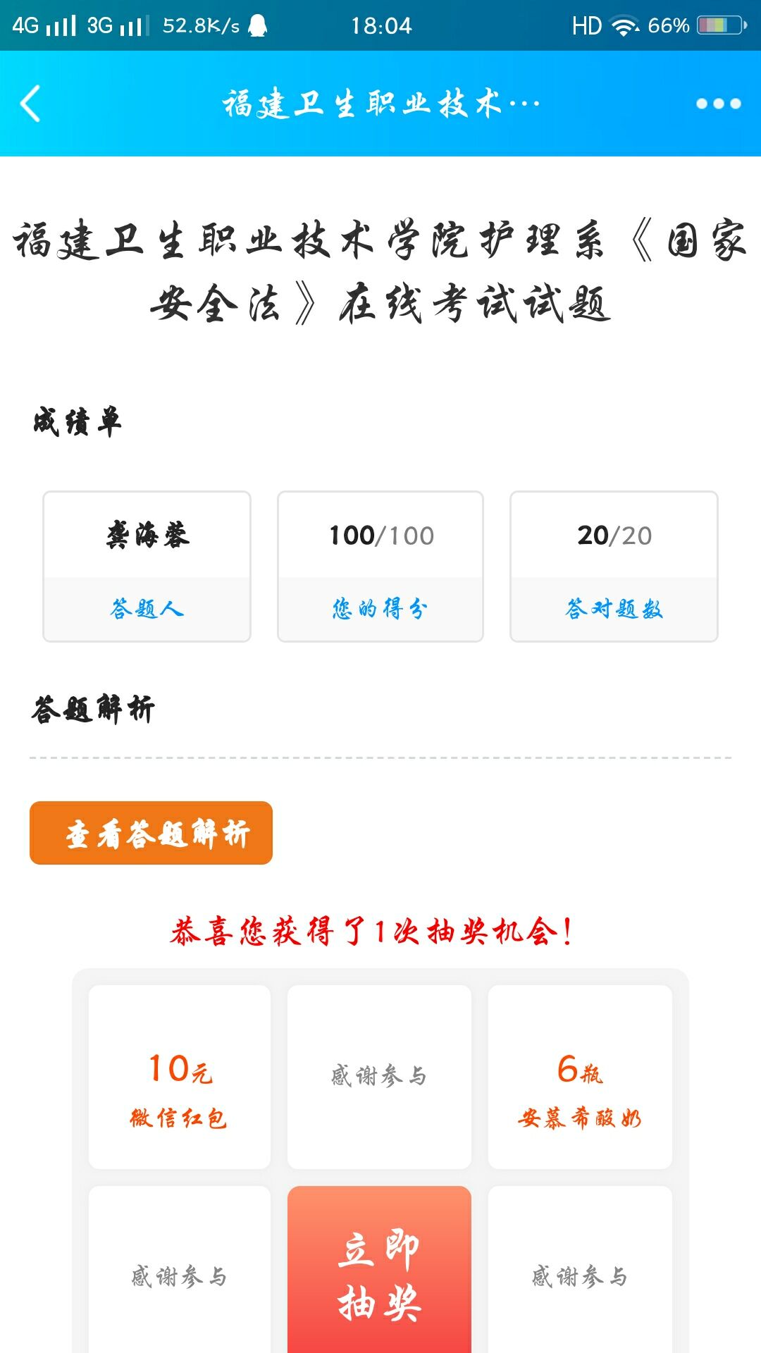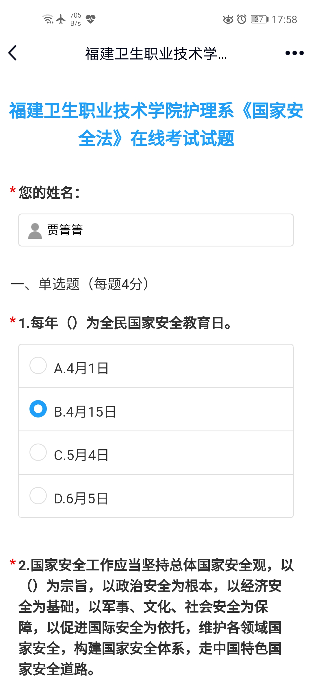 在第五个全民国家安全教育日来临之际,护理系党总支组织开展了主题为“坚持总体国家安全观,统筹传统安全和非传统安全,为决胜全面建成小康社会提供坚强保障”的在线答题活动,护理系全体党员参加了在线答题活动,护理系各教研室同步组织非党员教师一同参加答题活动。