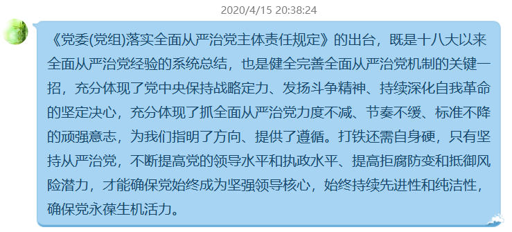 护理系团总支书记李宝珠表示,学习了《党委(党组)落实全面从严治党主体责任规定》文件精神,我将认真贯彻落实文件要求,主动服从学校统一安排、配合做好学生管理工作。同时,作为系团总支书记,将继续发挥团组织青年突击队作用,做好疫情防控期间的思想教育工作,引导青年学生按照相关文件要求,积极配合学校管理工作。