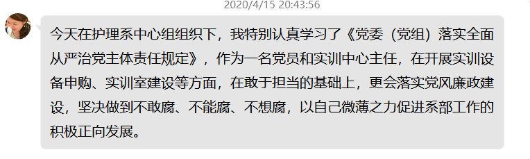 护理系实训中心负责人吴美丹表示,通过学习《党委(党组)落实全面从严治党主体责任规定》,作为一名党员和实训中心主任,在开展实训设备申购、实训室建设等方面,在敢于担当的基础上,更会落实党风廉政建设,坚决做到不敢腐、不能腐、不想腐,以自己微薄之力促进系部工作的积极正向发展。