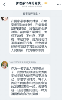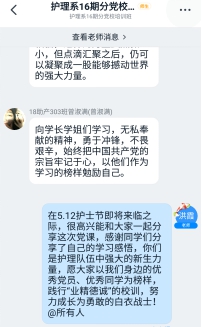 5月12日护士节来临之际,护理系第二党支部书记(双带头人)洪霞老师充分把握育人契机,组织了一堂有政治高度、情感温度和理论深度的“云”党课,对护理系121名入党积极分子们进行生命教育、信念教育、科学教育、道德教育,切实做好学生价值观引领。