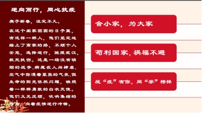 洪霞老师从此次疫情出发,通过挖掘抗击疫情过程中的鲜活素材,引导学生以战“疫”中的同学为榜样,学习最美逆行者的崇高精神,与时代同频共振,肩负起当代青年大学生的使命和担当。她还详细讲解了我们国家为防止疫情蔓延推出的一系列重要决定和有效措施,以及中华民族在面对重大磨难时,形成的万众一心、同舟共济的强大合力,引导学生能够更好地发扬爱国主义精神,增强民族自信心和自豪感,树立责任意识和大局意识。