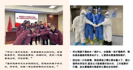 护理系第二党支部书记(双带头人)、内科护理教研室主任、2018年福建省名师培养人洪霞教授和护理系第二党支部宣传兼统战委员、内科护理教研室讲师向月,她们的丈夫都是此次福建省援鄂医疗队的队员。两位职教党员教师在得知她们的家人主动请缨驰援武汉抗击疫情时,用她们朴实的言语和行动,默默支持和付出,诠释她们对家、对乡、对党、对国的一片赤诚,也体现了作为共产党员的责任和担当。