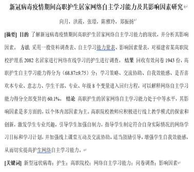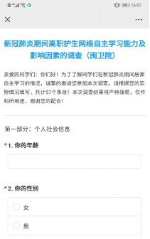 自2019年12月新型冠状病毒疫情发生以来,政府采取了强有力的居家隔离措施,所有学校延期开学。为减少新冠病毒疫情对正常教学的影响,保证教学质量和学生顺利完成学业,全国高校积极响应教育部“停课不停教、停课不停学”的号召,开展疫情防控期间的网络在线教学。在防控新冠病毒疫情的关键时期,宅在家,少外出,培养大学生的网络自主学习能力显得尤为重要。为了了解新冠病毒疫情期间高职护生居家网络自主学习能力的情况,护理系第二党支部的党员教师们开展了一项网络在线问卷调查研究,以了解居家护生的网络自主学习能力情况和相关的影响因素。