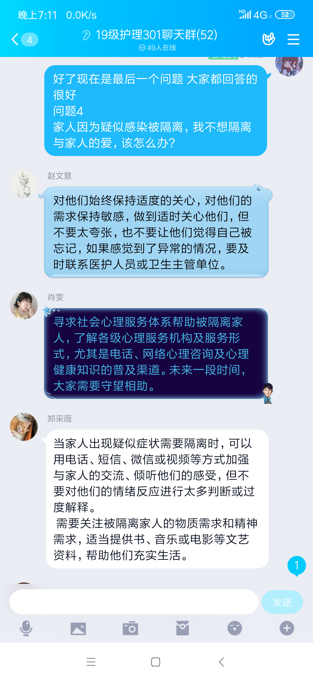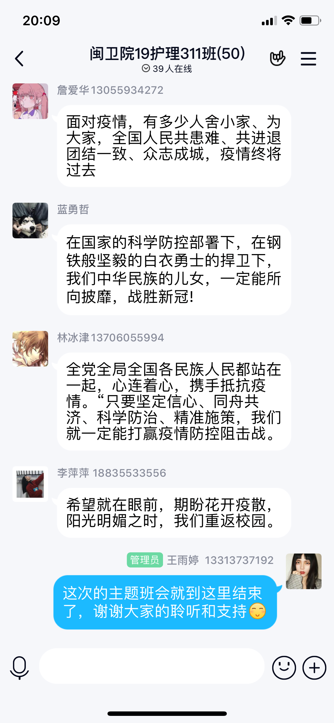 通过此次线上主题班会,同学们意识到心理健康的重要性,在相互交流的同时,也有效的引导同学们正确认识和对待疫情,增强同学们自我防控意识和共渡难关的信心,提高班级凝聚力,为即将到来的开学做好万全准备。
