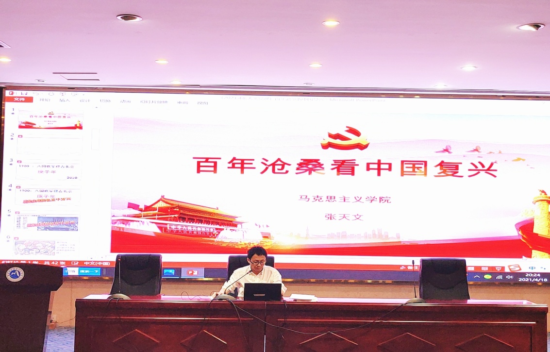 张天文在课上以“百年沧桑看中国复兴”为主题,紧紧围绕建党百年,深入浅出地阐释了中国共产党乘风破浪的百年奋斗历程、中国国际现状以及青年使命,带领大家深入学习习近平新时代中国特色社会主义思想。他说,历经百年风雨沧桑,当代中国正经历着我国历史上最为广泛而深刻的社会变革,当今世界正在经历百年未有之大变局,习近平新时代中国特色社会主义思想正是在这种大发展大变革大调整的背景下,在把握世界发展大势、应对全球共同挑战、维护人类共同利益的过程中创立并不断丰富发展的。