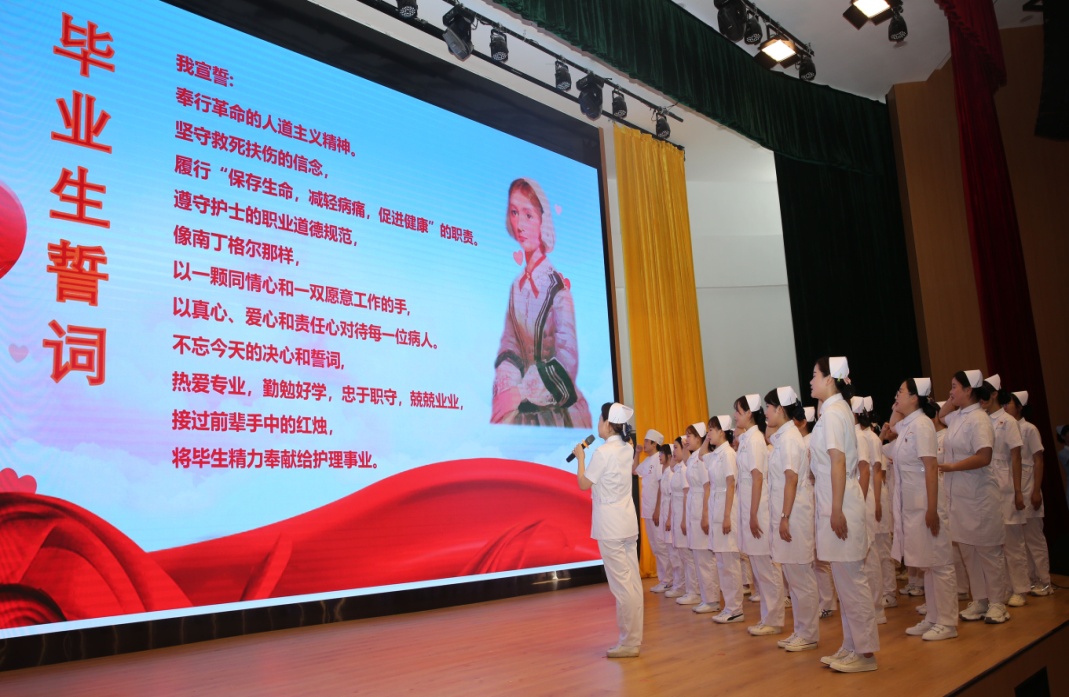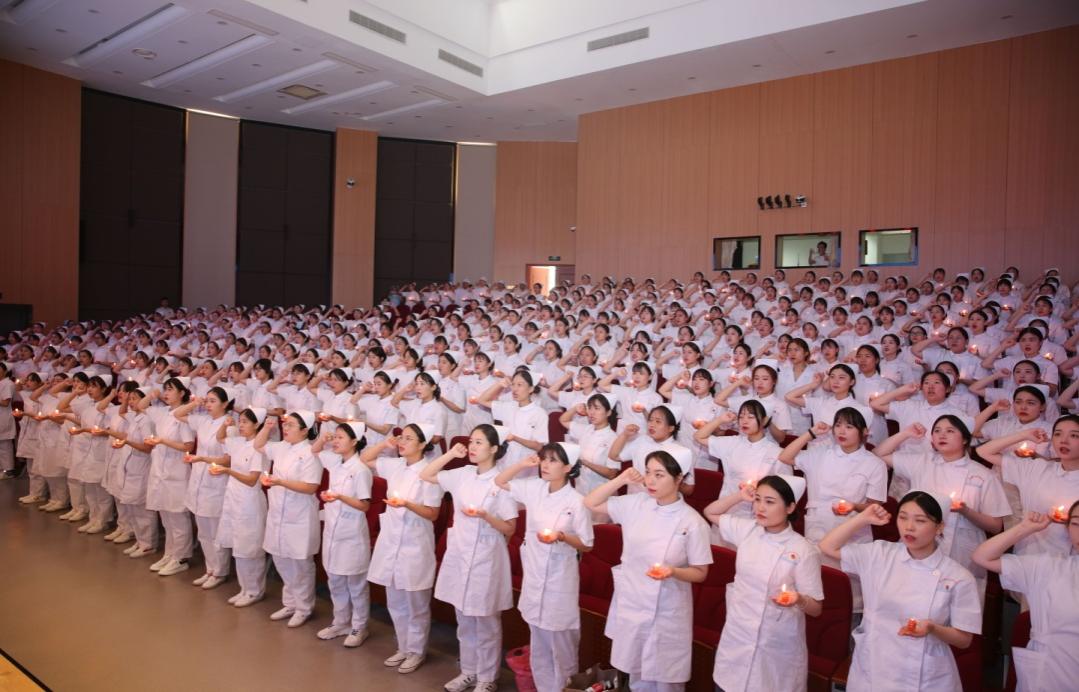 毕业生们手捧红烛,举起右手庄严宣誓:“……热爱专业,勤勉好学;忠于职守,兢兢业业;接过前辈手中的红烛,将毕生精力奉献给护理事业……”铿锵有力的声音久久萦绕在会场上空,昭示着她们正式加入白衣天使的行列。