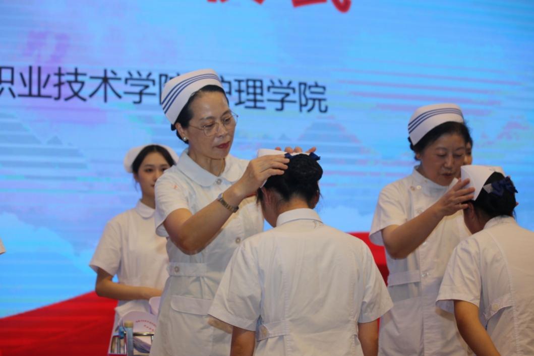 紧接着伴随着柔美的音乐进行神圣的授帽传光仪式。在护理学创始人南丁格尔像前,护理前辈们为单膝跪着的毕业生逐一戴上象征着圣洁天使的燕尾帽,毕业生接过前辈手中象征南丁格尔精神的奉献之火。白色的燕尾帽在红色烛光的映衬下,犹如神圣的光环照耀在每一个现场师生的心中。