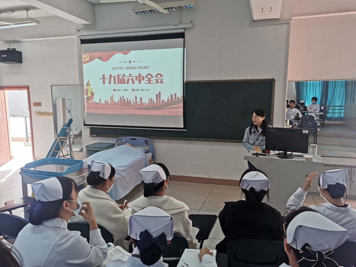为学习宣传党的十九届六中全会精神,深刻理解党的百年奋斗重大成就和历史经验,迎接党的二十大胜利召开,2021年12月15日,护理学院副院长王宪宁为联系班级讲授形势与政策课程——学习党的十九届六中全会精神。