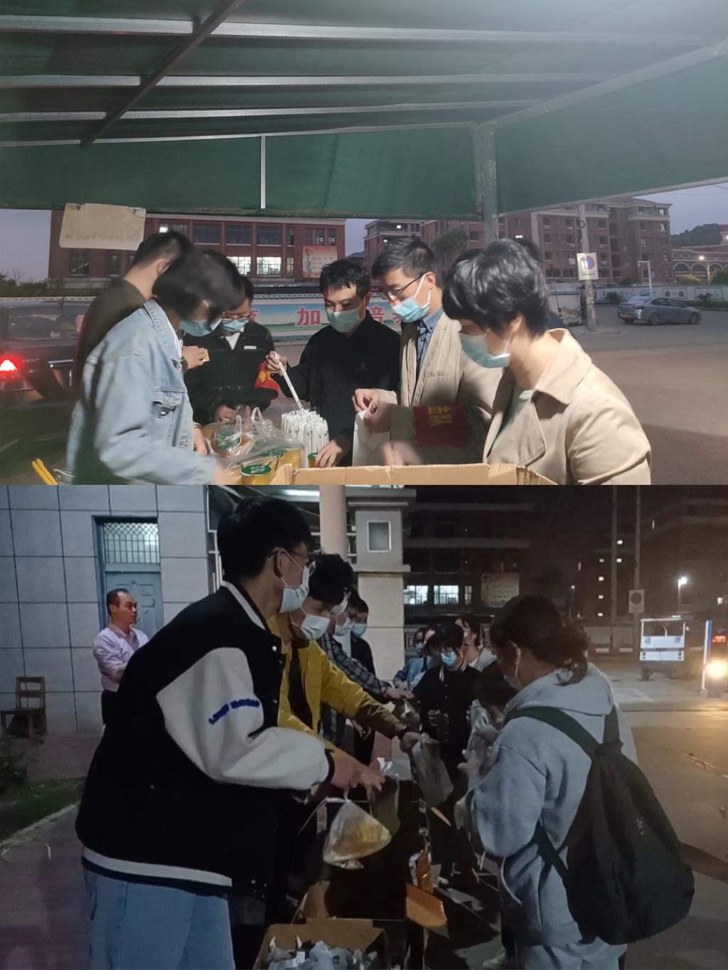 夜已深,校门口路灯下有翘首以盼的辅导员老师们,还有为他们备下一份份爱心便当的同学们。一条又一条的信息焦急地询问:“到集合地了吗?”一通又一通的电话反复地拨打:“登车了吗?”