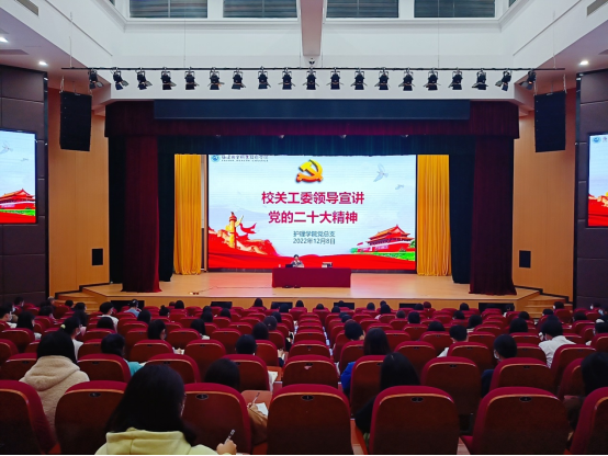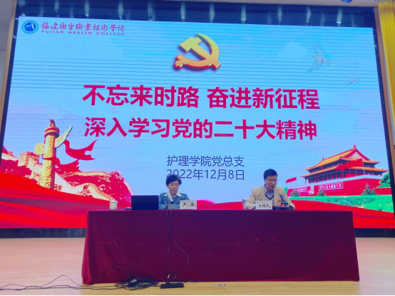 为深入学习贯彻党的二十大精神,12月8日下午,护理学院党总支开展“不忘来时路,奋进新征程”主题活动。本次活动有幸邀请到校关工委主任严肃、副主任陈雄作为主讲嘉宾,护理学院师生代表和组织统战部、人事处、财务处共计200余人现场参加宣讲会,护理学院其他师生通过线上收听收看宣讲报告。