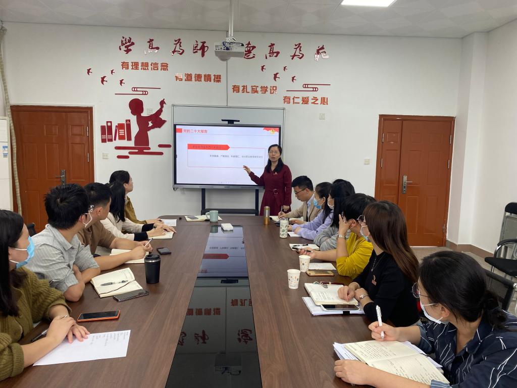 首先,龚海蓉从党的二十大报告的主题、关键要点带领教师们重温党的二十大报告,带领大家一起学习回顾了十年来我们党经历的三件大事、前进道路上牢牢把握五个重大原则以及从现在起中国共产党的中心任务。