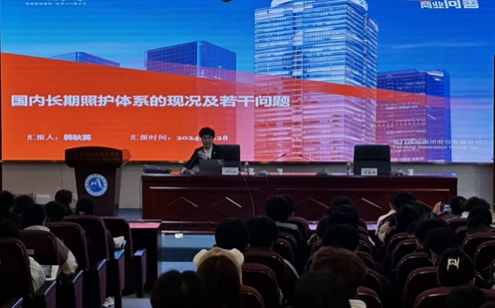 韩秋英教授从中国人口老龄化形势、长期照护相关概念以及中国长照体系发展的现况三个方面展开阐述。她以通俗易懂的语言和丰富的数据案例阐释我国人口老龄化的现状,从而引出长期照护的重要性,这些理论对老保专业学生的岗位责任认知有着实际指导意义。最后韩秋英教授用自己切身经历现场解答了老保专业学生学习、发展以及工作的疑问,将现场气氛推到高潮。