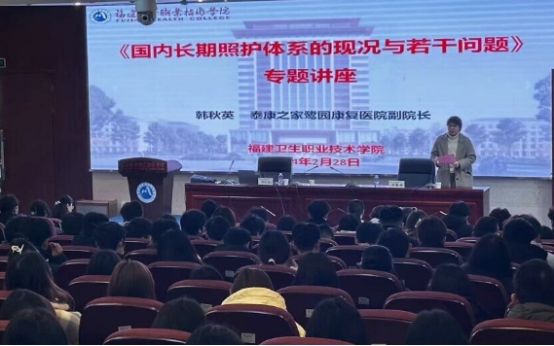 2024年2月28日上午,护理学院邀请泰康之家鹭园养老服务&康复医院有限公司/主任护师韩秋英教授开展《国内长期照护体系的现况与若干问题》专题讲座。本次讲座由护理学院院长肖春秀主持,护理学院教师及老年保健与管理专业学生聆听了此次讲座。