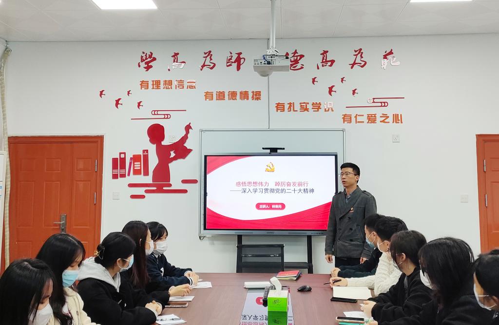 为深入学习宣传贯彻党的二十大精神,引导学生干部学思悟践党的二十大精神,推动党的二十大精神见行见效,激发广大青年爱党爱国情怀。2022年12月7日,护理学院林来元副书记在系部楼301会议室开展以“感悟思想伟力,踔厉奋发前行”为主题的专题党课。参加此次专题党课的有护理学院团总支书记林飞准、团总支副书记张龙以及学生会学生干部们。