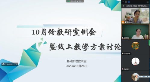 按照校领导的嘱托,护理学院不断调整优化线上授课准备工作,基础护理教研室全体老师在腾讯会议上召开 “互助共享,提高线上实训教学有效性”线上教学方案讨论会。大家结合以往线上实训教学存在的问题进行交流、积极反思、各抒己见,针对实操课用物场地受限和师生互动受影响两大突出问题,老师们群策群力,共同研讨解决问题的方案,通过灵活调整教学进度,直播时开启摄像头、连麦互动等方式保证教学效果。