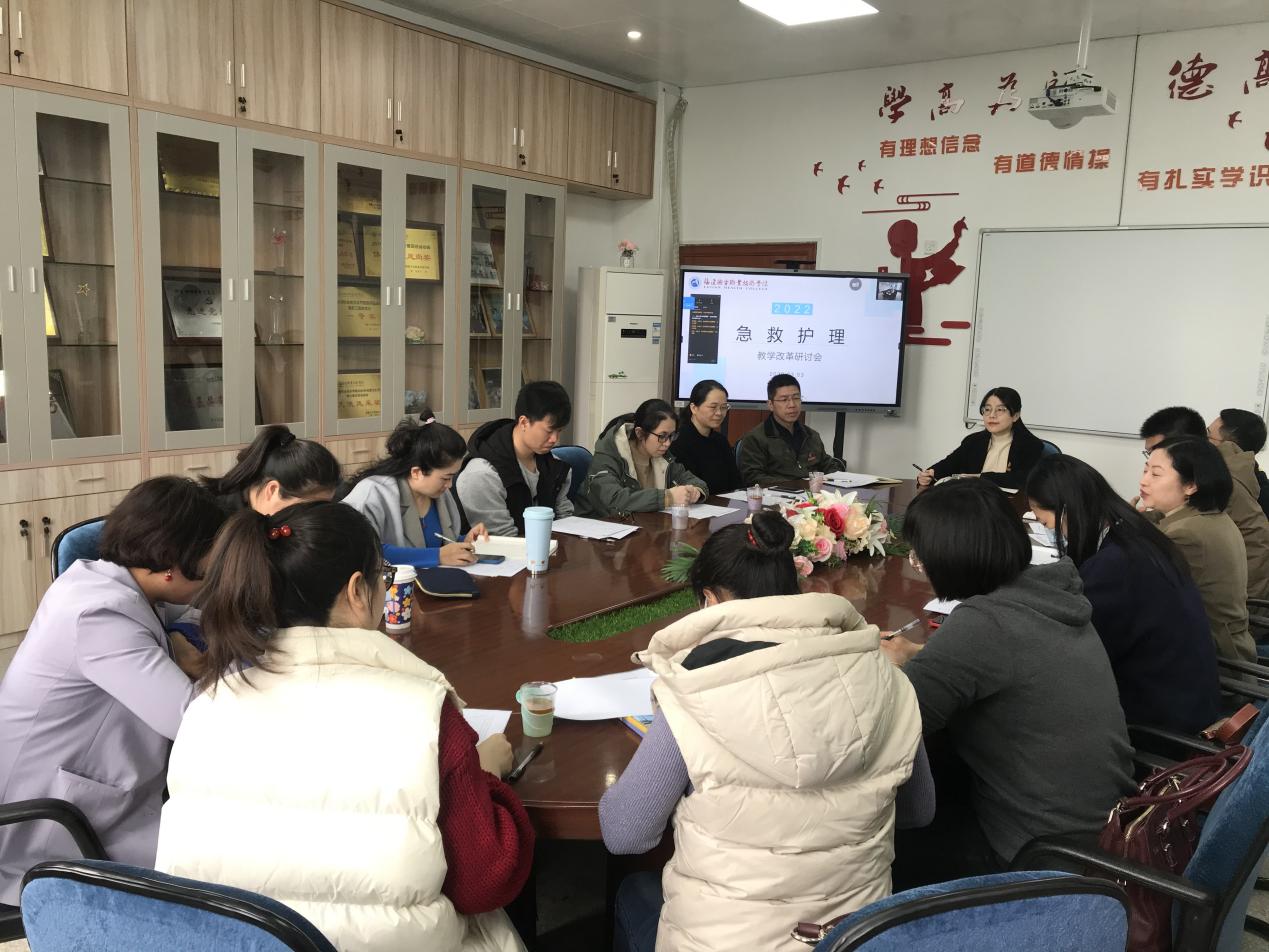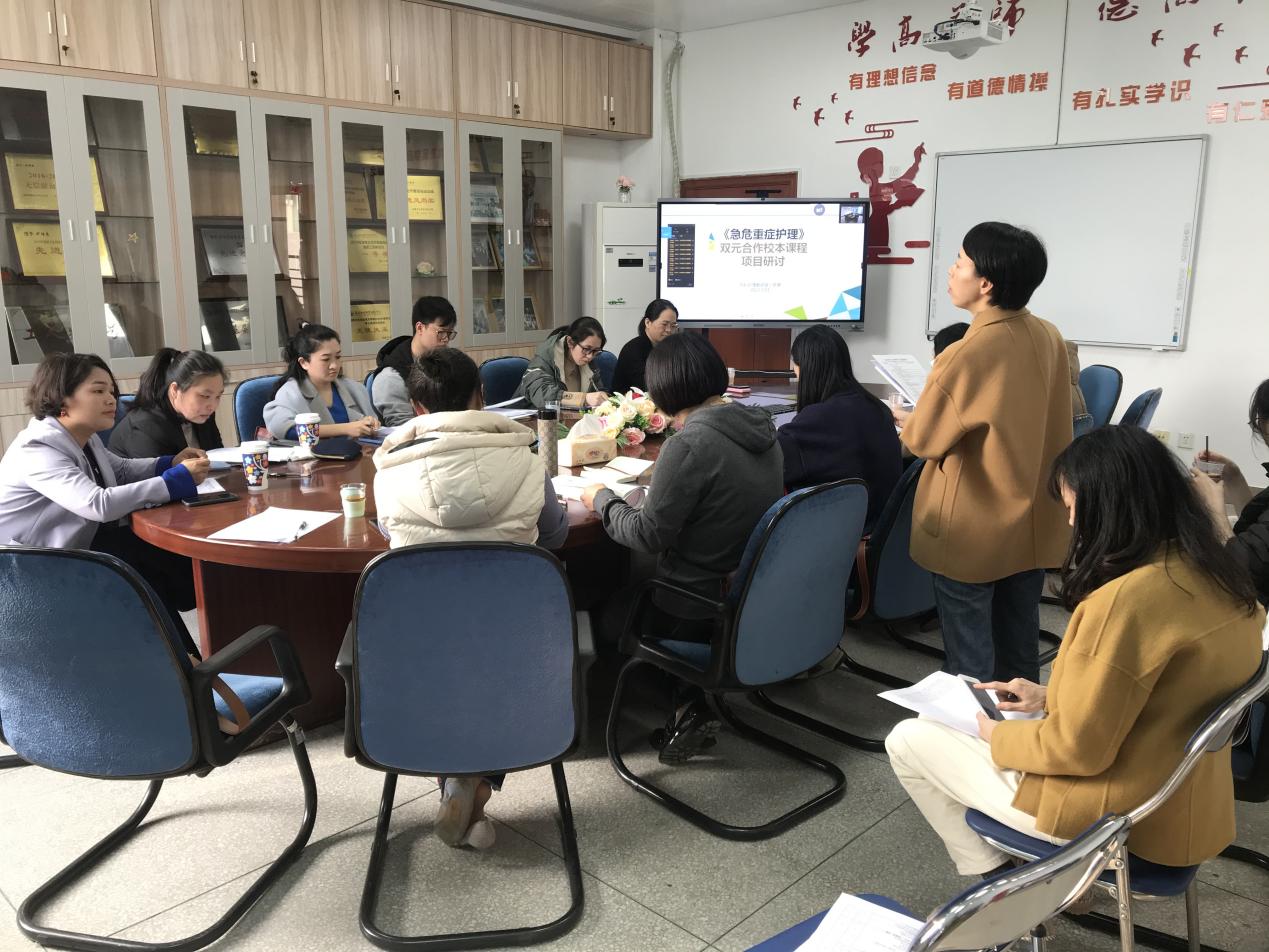 “急救护理”系列示范建设以建成校级标准、校企双元、产教融合的资源共享课程、在线开放课程为目标,以进一步完善课程资源开发及校企合作双元教材研发为重点。研讨会上,护理学院第二党支部书记兼内科护理教研室主任洪霞、党员教师张璟和龚仁燕分别介绍了《急危重症护理》课程拟定开发微课设计思路、课程拟修订教学模式、课程网站建设与完善思路等课程示范建设任务的实施方案以及双元合作校本教材的设计思路、老年保健专业《基本救护技术》的进度。各医院临床教师热烈讨论,积极建言,引入职业技能培训中采用的新标准、新规范、新技术,使日常教学更加贴近临床实践。