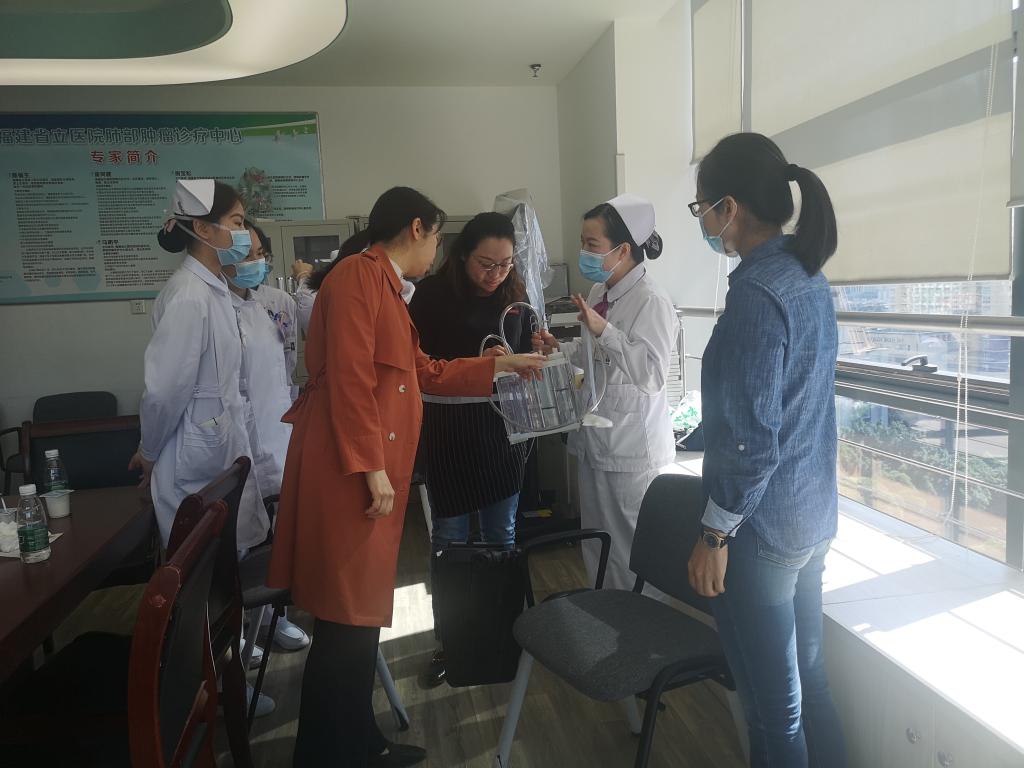 涂秀华老师还热情地为教研室的老师们分享了她制作的教学视频——《气胸病人的胸腔置管术》、《胸腔闭式引流管的拔管方法》、《肺癌病人的术前术后健康宣教》,交流了肺癌患者的微创胸腔镜手术治疗与护理,还向老师们展示了该科室获国家专利的多功能输液架,使老师们更新了知识,拓宽了视野。