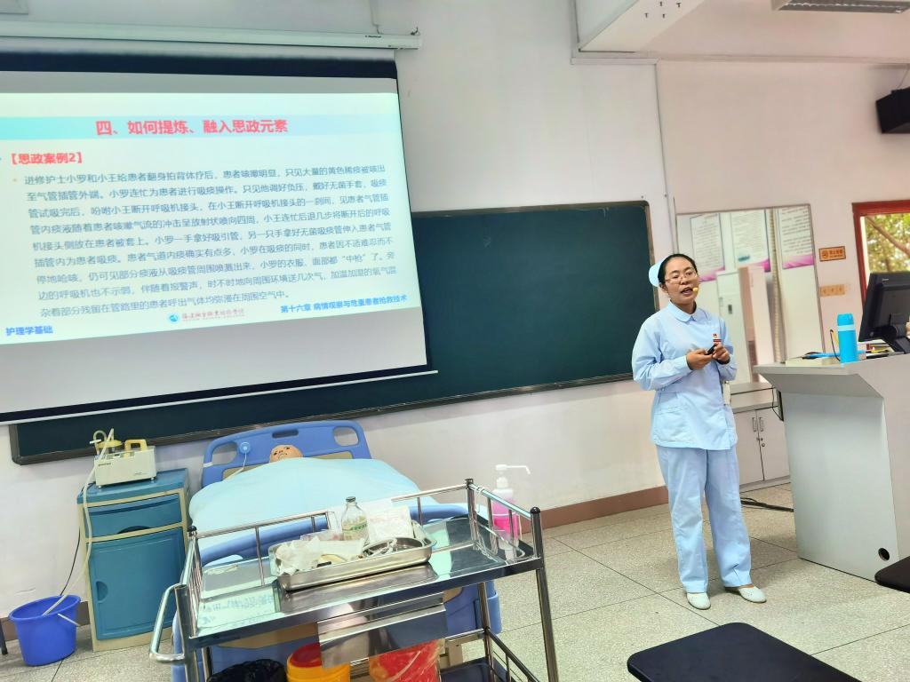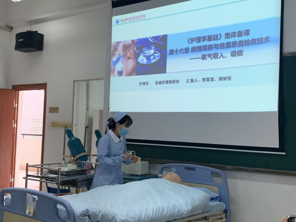 此次活动由贾箐箐老师主讲,贾老师阐述了本次集体备课的四个主要内容:低氧血症的分度、如何调节吸痰负压、吸痰手法及顺序、如何提炼并融入思政元素,并且拓展了经口鼻吸痰的禁忌症和并发症的内容。