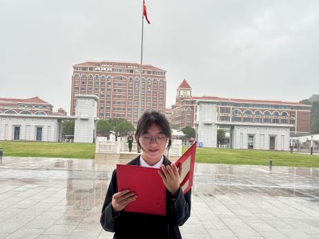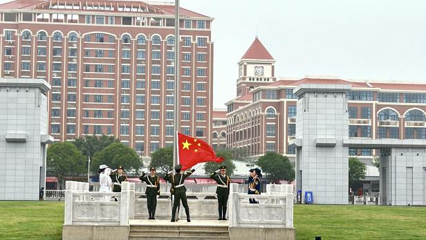 清晨的崇健楼正门广场庄严肃穆,护理学院团学骨干列队站立。伴随着雄壮的国歌声,鲜艳的五星红旗在同学们的注目礼中缓缓升起,迎风飘扬。