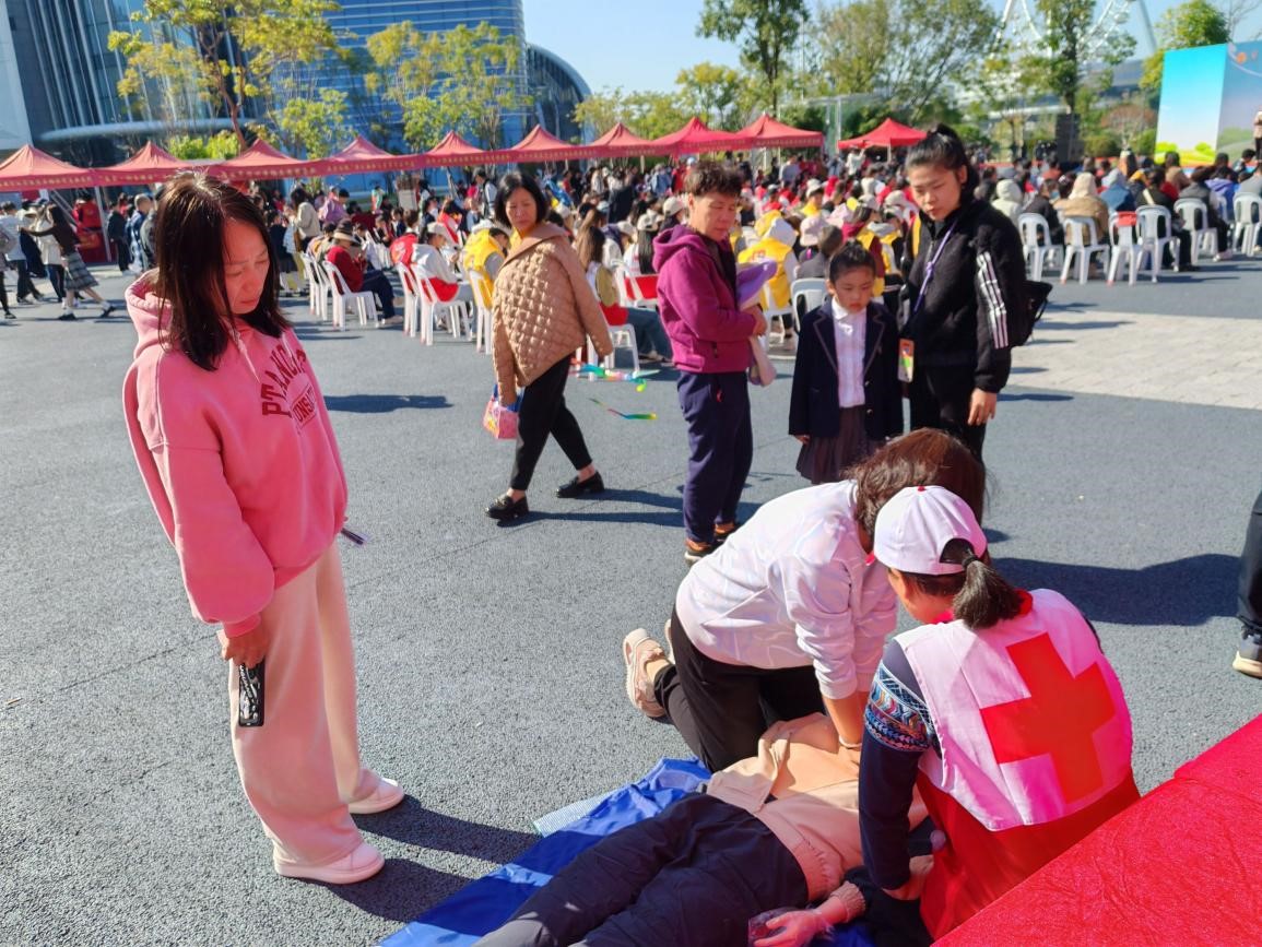 急救知识是保障生命安全的重要防线。在社区广场上,另一组志愿者们他们利用人体模型,现场演示心肺复苏等常用急救技能的操作步骤,从按压的位置、频率、深度,到气道的打开方式、异物的排出技巧等,都一一详细解说并反复示范。居民们纷纷踊跃参与,在志愿者的指导下亲身体验急救操作,许多居民表示:“这些急救知识和技能以前只是听说过,今天真正上手操作了才知道其中的要点和重要性,以后遇到突发情况心里就有底了。”