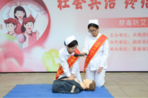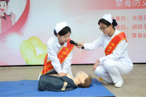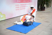 在展示急救技能这一环节,护理学院青年志愿者向大家展示了CPR,现场气氛热闹。演示急救技能时,她们身姿挺拔、目光笃定,瞬间成为全场焦点。一边向大家介绍步骤,一边双手交叠、找准按压点,跟随节奏有力按压,模拟着与死神争分夺秒的紧张;俯身、通气,标准的人工呼吸操作,都诠释着志愿者们的专业与专注