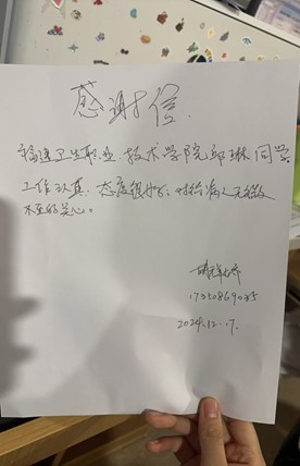 近日,护理学院22护理312班邱琳同学,在厦门大学附属第一医院肾内科实习期间,收到了住院患者的亲笔感谢信。科室护士长及科室老师也对邱琳同学的护理工作给予了高度认可。
