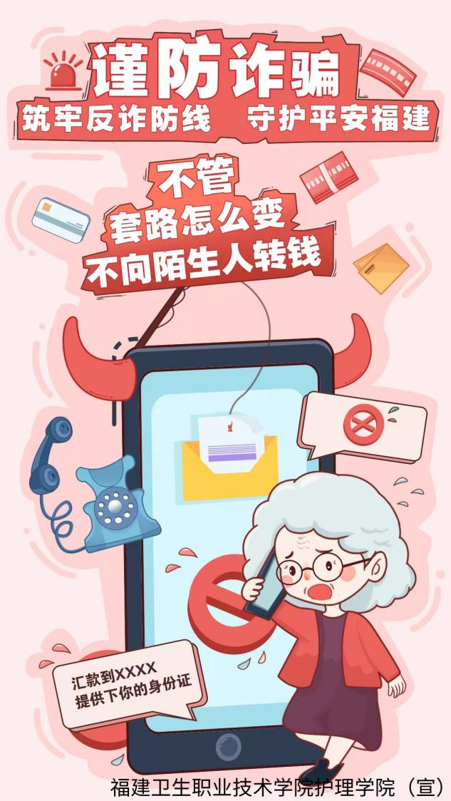 海报以“谨防诈骗”为核心主题,通过“筑牢反诈防线,守护平安福建”的口号,强调了防范诈骗对于维护社会平安的重要性。“不管套路怎么变,不向陌生人转钱”这一口号简洁明了,直接点出了诈骗的常见手段——诱骗受害者转账。同时,通过老年女性角色的惊恐表情和手机屏幕上的禁止符号,增强了警示效果,使得公众能够更容易地理解和记住防范要点。
