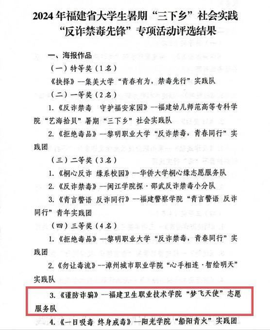 在2024年福建省大学生暑假“三下乡”社会实践“反诈禁毒先锋”专项活动中,我院“梦飞天使”志愿服务队凭借卓越的海报作品,荣获三等奖的佳绩!