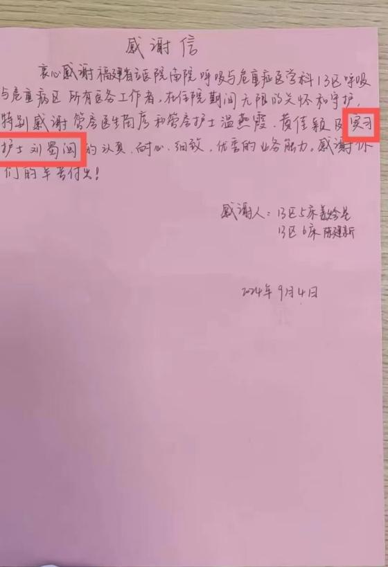 近日,护理学院22护理309班刘蜀闽同学,在福建省立南院呼吸与危重症医学科13区呼吸与危重病区实习期间,收到了住院患者的亲笔感谢信。科室护士长及科室老师也对刘蜀闽同学护理工作给予了高度认可。