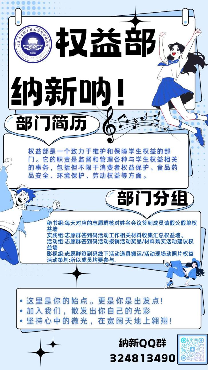 加入学生会,你将拥有更多的机会参与到学校的管理和建设中,为自己的大学生活增添一抹绚丽的色彩。不要再犹豫了!加入学生会活动多多,机会多多,各个部门覆盖你校园学习、生活的方方面面,快来扫描二维码加入我们纳新群,多多了解我们吧!期待在9月9日晚上与你相遇!