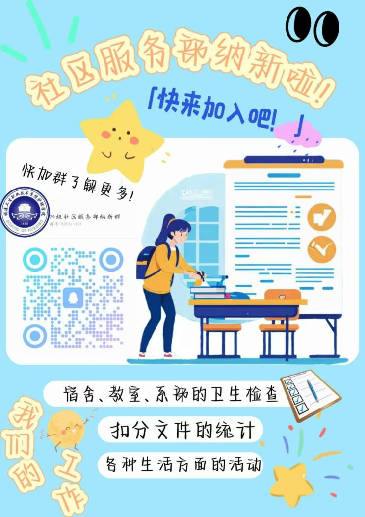 社区服务部是督促学生养成良好的卫生习惯,监督学校环境卫生的重要部门,为同学们营造一个温馨的宿舍以及学习环境。社区服务部本着公平、公正、公开的原则,认真对待每周的劳动卫生检查,最平凡的事情往往指向最崇高的目标。