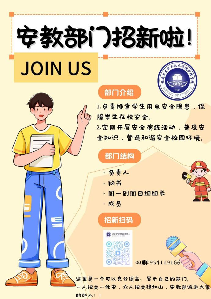 安教部是保障同学们的在校安全,提高同学们的安全意识,共同创建美好和谐校园。联系校部及系部组织相应的活动。以学院及学校创造一个具有较强安全意识环境为己任。
