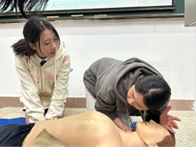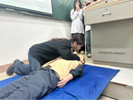 心肺复苏(CPR)这一环节更是重中之重。红十字会成员们先以通俗易懂的话术拆解操作流程:判断意识、胸外按压、开放气道、人工呼吸,每个动作的力度、频率都严苛讲究。为让同学们亲身体验,模拟假人与急救设备齐齐上阵。同学们初次上手略显紧张,按压深度不足、吹气节奏紊乱,成员们便一对一指导,耐心地手把手纠正,直到操作规范为止。