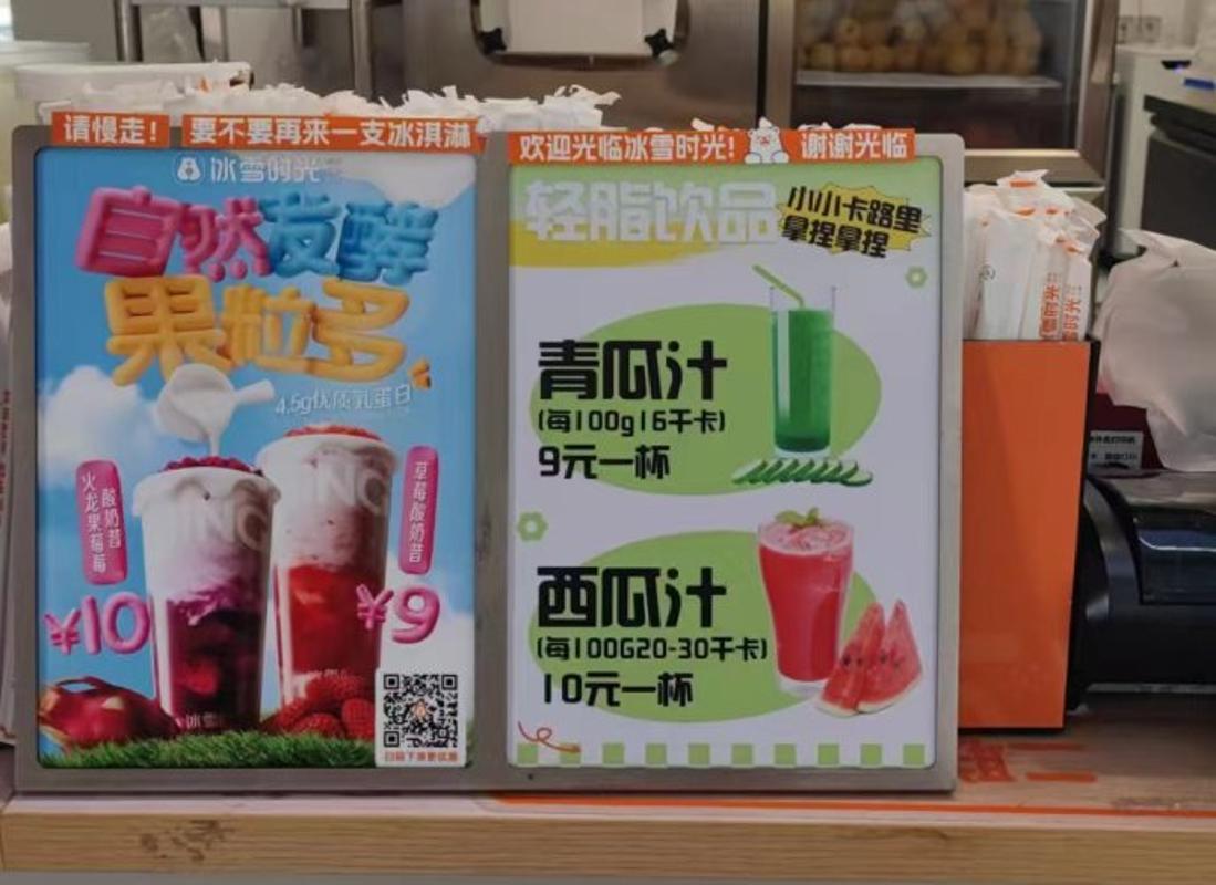 走进饮品店,健康选择必不可少,冰雪时光的轻脂饮品你值得拥有!青瓜汁每100克仅16千卡,清爽的黄瓜味,满满都是大自然的清新气味。还有西瓜汁,每100克20-30千卡,清甜可口,解渴消暑。这些饮品,热量不高,却能为身体快速补充水分和营养,是减脂期的“神仙水”。