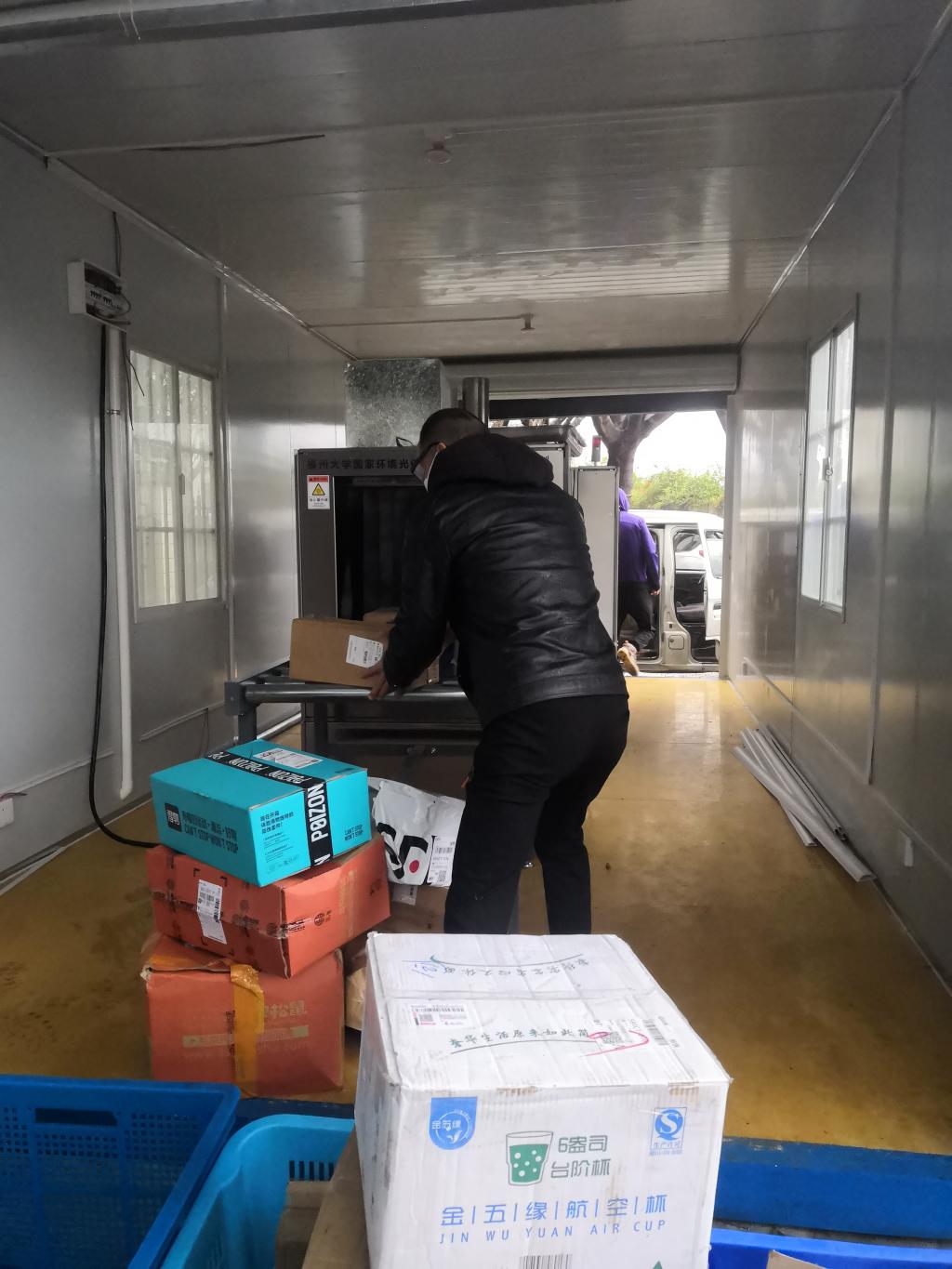 该消杀工作站配备的紫外光催化复合消杀设备采用消杀能力最强的254nm波长紫外线光源,具有快速高效无污染的消杀特点,每小时可消毒2000多件货物。所有进校的快递在校门外中转站进行消毒液喷雾消毒后,再转运至紫外光催化复合消杀工作站进行二次消毒。冷链食品通过紫外光催化复合消杀后再入库储藏。该工作站的启用,为校园防疫工作增添了新利器。