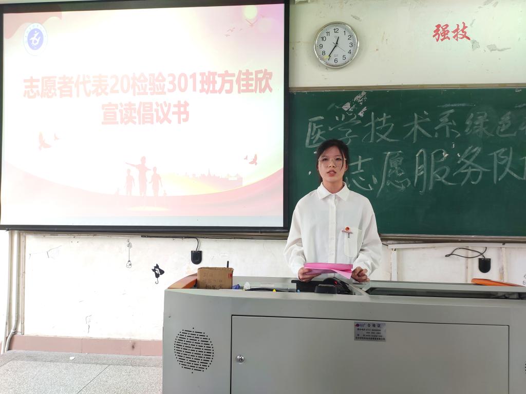 医学技术系绿色环保行动志愿服务队志愿者代表20检验301班方佳欣同学宣读倡议书并表示,志愿服务队会秉承着“立足校园,服务社会”的原则,为“爱护环境、从我做起”的志愿者宗旨贡献一份力量。