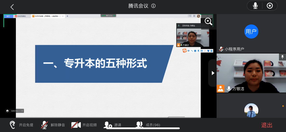 随后,校友程王璐将自己面临就业与升学的选择、专升本复习材料、复习计划及方法等切身经验毫无保留的分享给大家,鼓励学弟学妹们坚定信心,树立终身学习的理念。