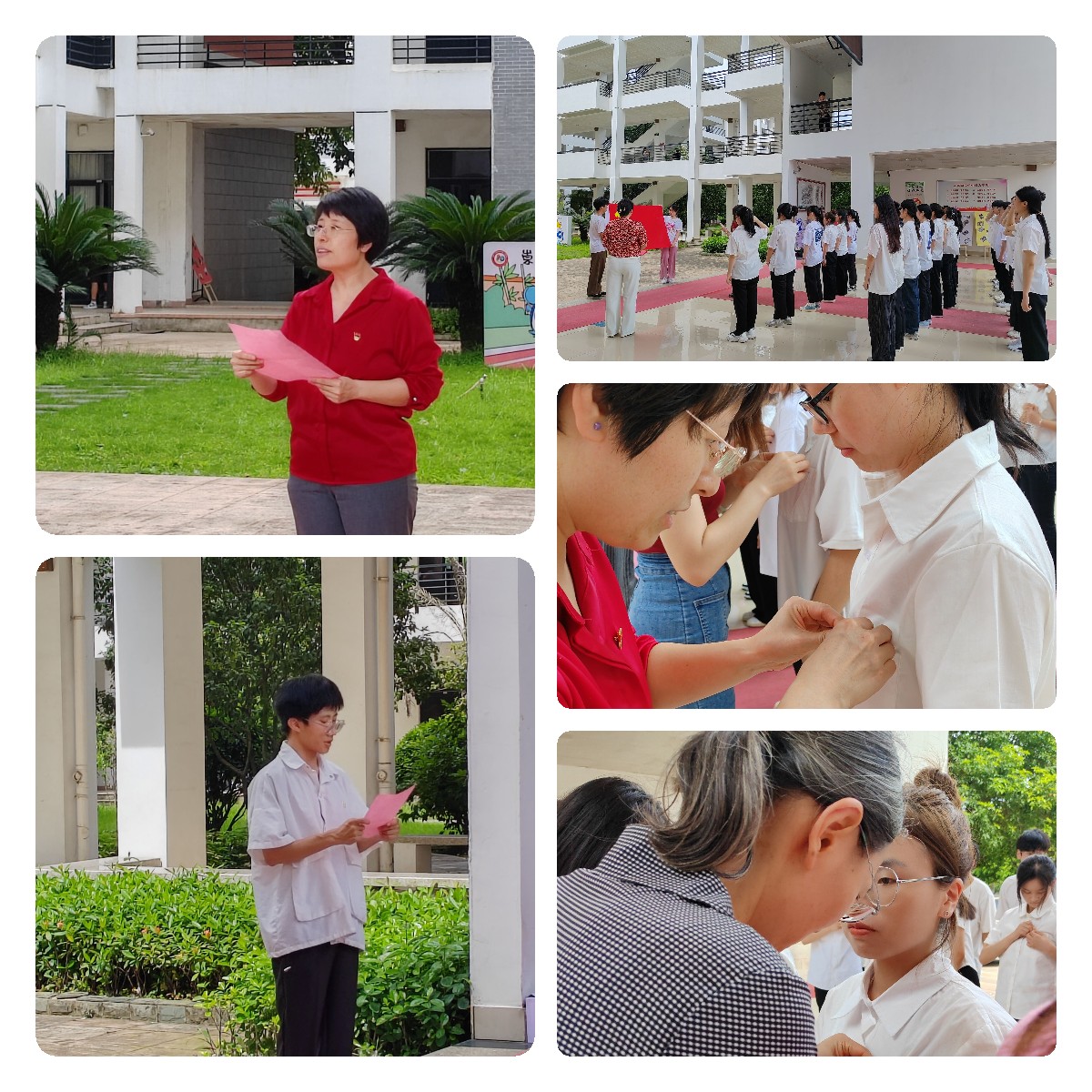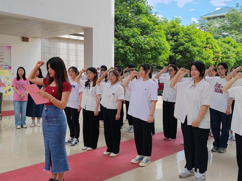 宣誓仪式在教学楼前进行,雄壮肃穆的国际歌拉开仪式帷幕。林燕同志宣读参加入党宣誓仪式的预备党员名单。在厉逢妹同志的带领下,预备党员面向党旗庄严宣誓。激昂的誓言字字千钧,掷地有声,久久回荡,留下闽卫院党员学子的忠诚承诺。