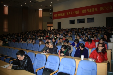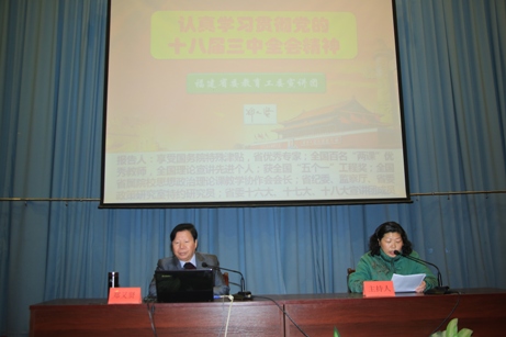 根据省委教育工委《关于开展党的十八届三中全会精神宣讲活动的通知》精神,3月4日下午,我院邀请省委宣讲团成员、福建师范大学博士生导师郑又贤教授来校作《认真学习贯彻党的十八届三中全会精神》的宣讲报告。在家院领导、全体教职工、学生预备党员及院学生会干部共400余人与会聆听报告,宣讲会由副院长魏立娜同志主持。