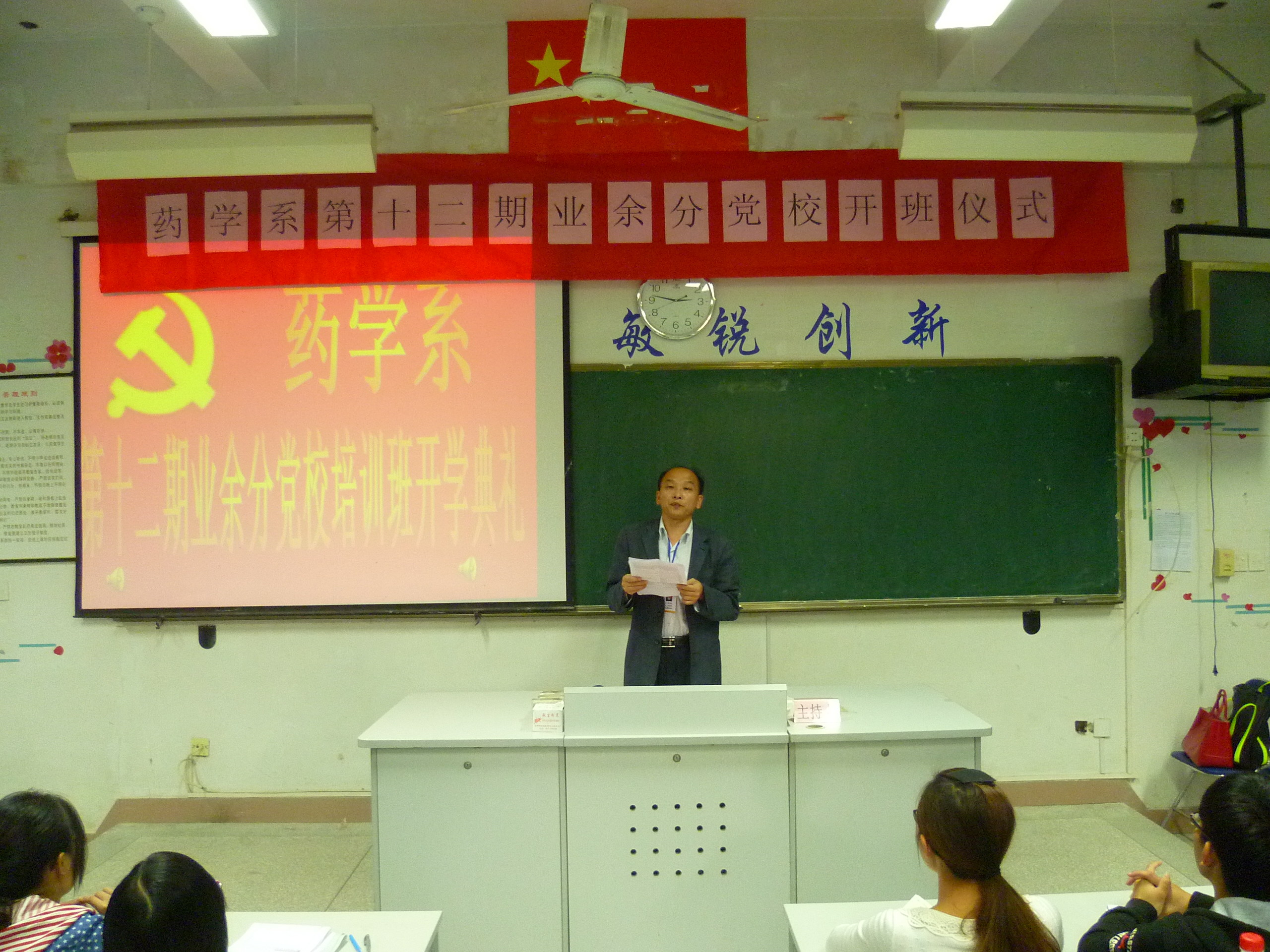 药学系于4月16日在药学系第一阶梯教室举行第十二期系部分党校培训班开班典礼。药学系党总支苏爱华副书记、系团总支书记王钝锐老师出席了本次开班典礼。