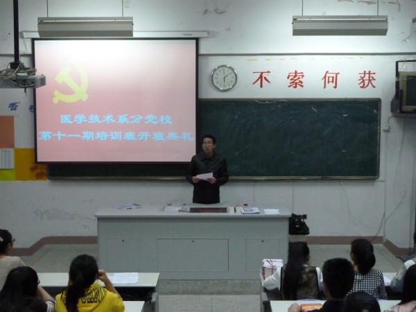 2013年4月25日晚,医学技术系在第2阶梯教室举行第十一期系部分党校开班仪式。本次活动由郭淼丽老师主持,出席的人员有系党总支郭礼坚副书记、各班辅导员以及学员们。