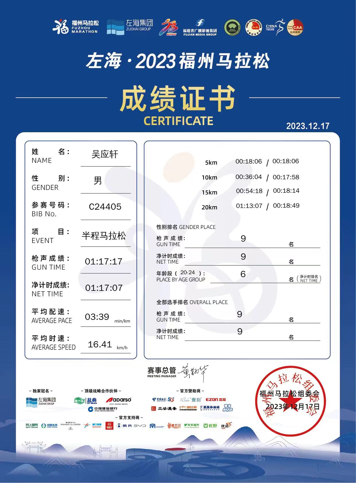 福州马拉松目前已是中国田径协会金牌赛事和世界田联认证的标牌赛事,也是国内规模最大的马拉松赛事之一。本次比赛参赛人数共计5万人,其中全程马拉松1.2万人,半程马拉松2.3万人,健康跑1.5万人,报名涵盖了全国34个省份的跑步选手,其中不乏国家队、省队等专业运动员以及10余个国家的外籍选手。开云学子吴应轩在半程马拉松项目中斩获国内第九名,达标马拉松国家二级运动员。
