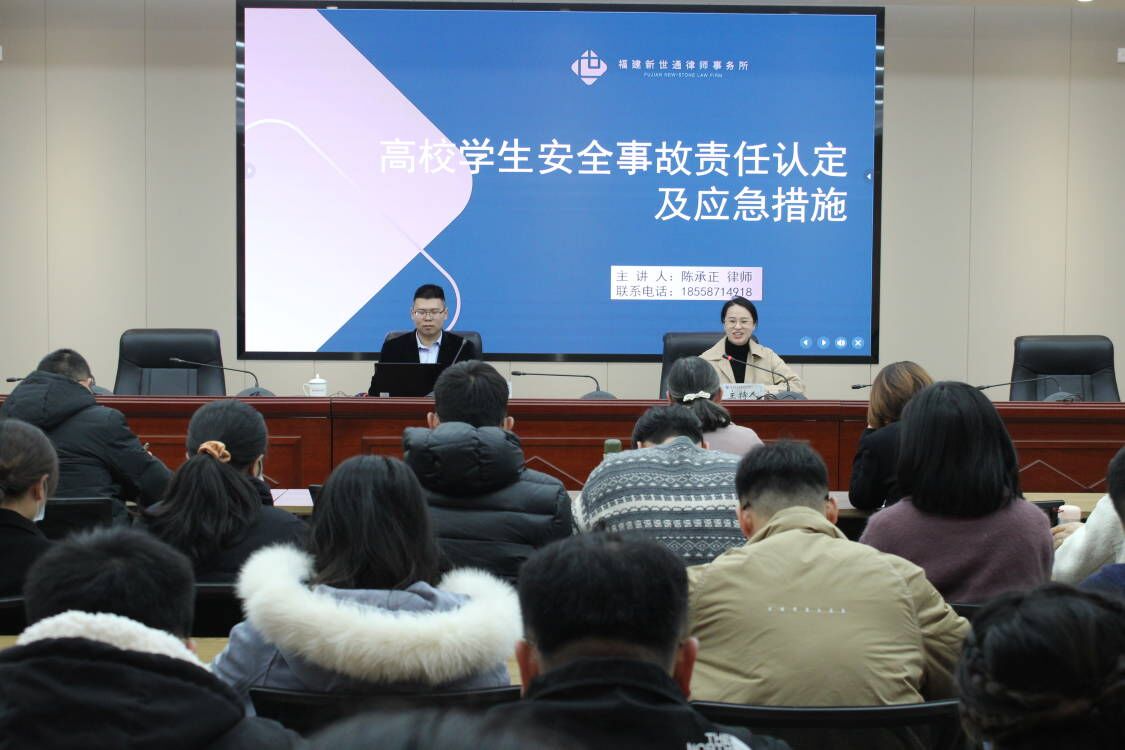 为进一步强化法治教育,提高学生安全管理法律意识,12月19日,学校法律顾问福建新世通律师事务所陈承正律师在行政楼六楼会议室作《高校学生安全事故责任认定及应急措施》专题讲座。讲座由党政办公室副主任陈盛兰主持,党政办公室、学生工作部、安全工作处及各学院副书记、辅导员约70人参加。