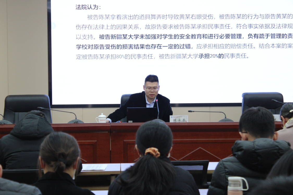 陈承正从学生伤害事故案例分享、高校校园安全事故责任认定的法律依据及如何应对学生安全事故三个方面展开,以案释法,以法论事,为大家生动普及《中华人民共和国民法典》《学生伤害事故处理办法》《普通高等学校学生安全教育及管理暂行规定》等法律法规。讲座中,教职工积极进行法律咨询互动,讲座效果良好。