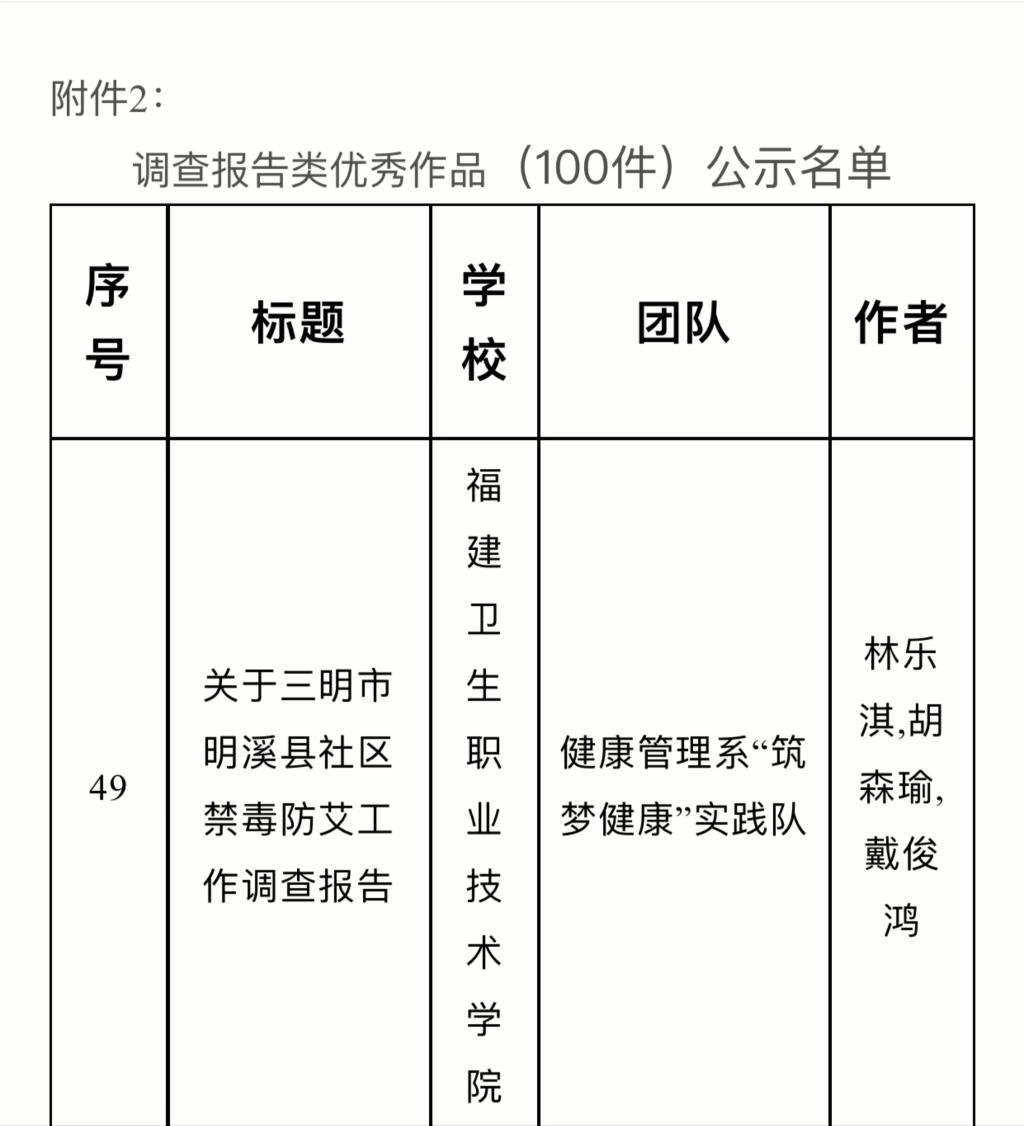 近日,由中国大学生在线举办的“大我青春”2023年暑期社会实践成果征集展示活动遴选结果正式揭晓!开云公共卫生与健康管理学院“筑梦健康”实践队作品《关于三明市明溪县社区禁毒防艾工作调查报告》从全国1085所高校的2.6万余件作品中脱颖而出,成功入选调查报告类优秀作品。