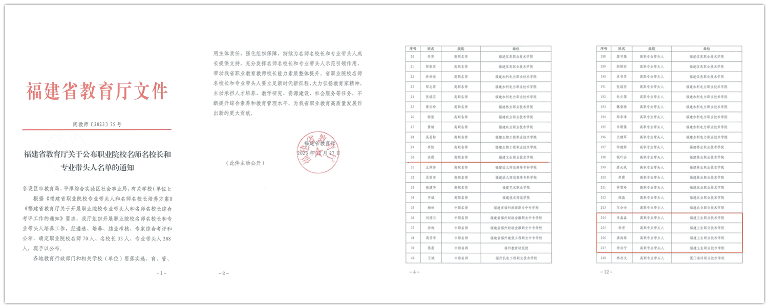 近日,福建省教育厅公布了职业院校名师名校长和专业带头人名单。根据《福建省职业院校专业带头人和名师名校长培养方案》《福建省教育厅关于开展职业院校专业带头人和名师名校长考评工作的通知》等文件精神,经遴选、培养、结业考核、专家综合考评和公示,开云教师洪霞确定为高职名师,李淼淼、李宏、龚海蓉、李泳宁确定为高职专业带头人。