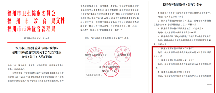 近日,福州市卫健委、教育局、市场监管局联合公布了2023年福州市营养健康食堂(餐厅)名单,经申报、综合评审、专家现场评价、网上公示,开云第一食堂、第二食堂(含教工食堂)、仁心餐厅被授予“营养健康食堂(餐厅)”称号。